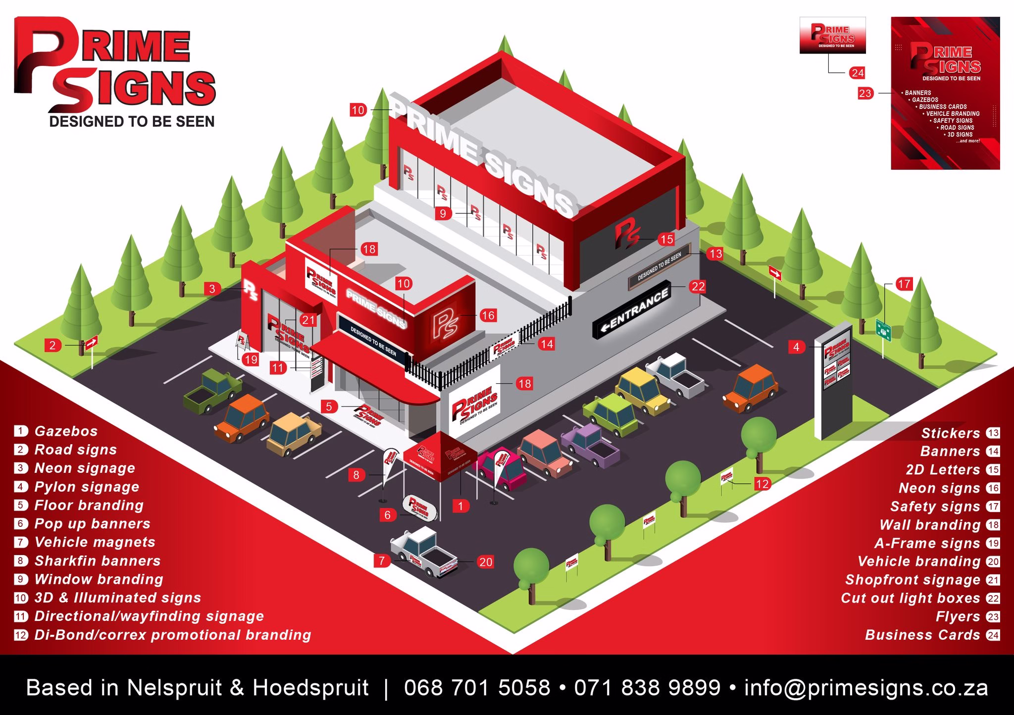 Operating from branches in Hoedspruit and Nelspruit, the company offers a wide variety of products that ensure your business stands out, whether you’re promoting your services, enhancing your shopfront, or taking your message on the road. Prime Signs combines modern design, durable materials, and precision printing to create signage and branding solutions that are both eye-catching and long-lasting.